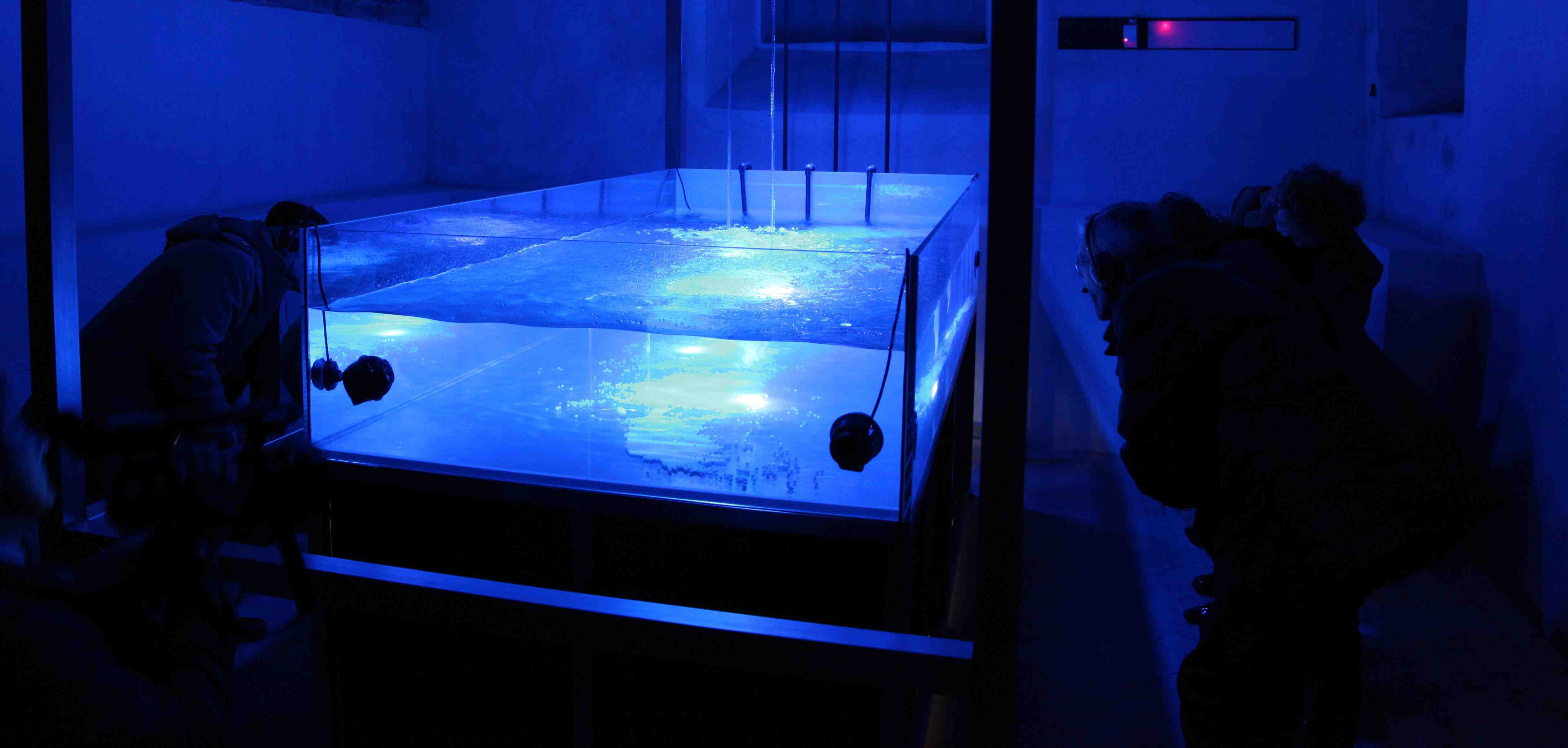cuffie dell’Mp3 a disporsi intorno alla tavola d’acqua. Gli sarà comunicato che sta per vivere un’esperienza in cui dovrà utilizzare due sensi: la vista e l’udito. Il metro cubo d’acqua che ha davanti, ora immobile, sta per fluire, ondeggiare e vorticare per dare la possibilità ai suoi umidi occhi di osservarne la dinamica, con gli stessi metodi che usava Leonardo.