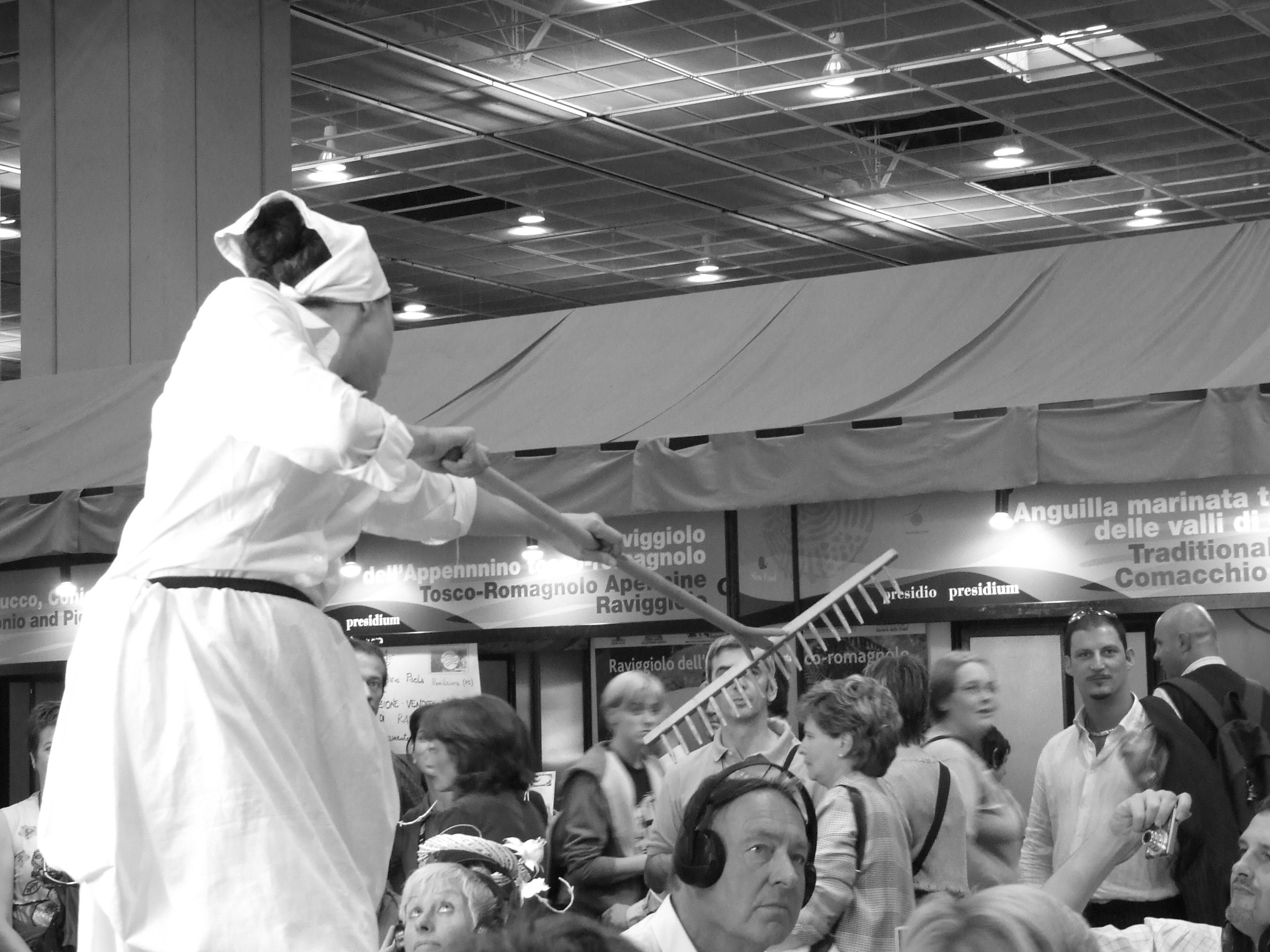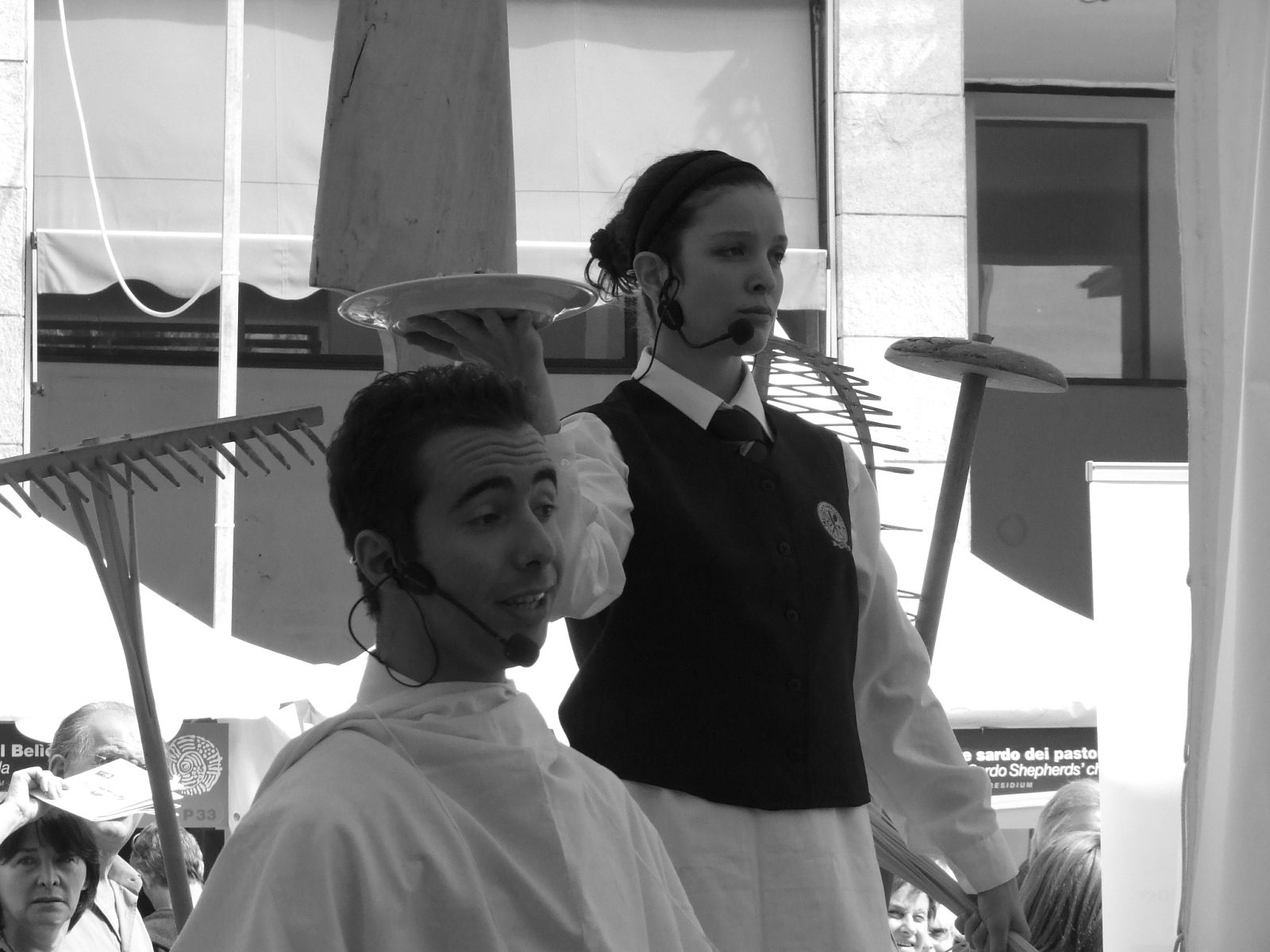 I personaggi della performance indossano i medesimi completi dei camerieri in sala, e svolgono il ruolo di camerieri sino ad un attimo prima del momento in cui il pubblico è invitato ad indossare le cuffie ed entrare nel mondo della rappresentazione. A quel punto, con semplici ma efficaci aggiustamenti del costume fatti con tovaglie, posate, spaghetti e cucchiai, si trasformeranno in cantanti lirici, ed intoneranno riflessioni gastrosofile sul valore organolettico e culturale del cibo, sul funzionamento dell’apparato digerente e sulle prelibate eccellenze alimentari dell’Emilia-Romagna.